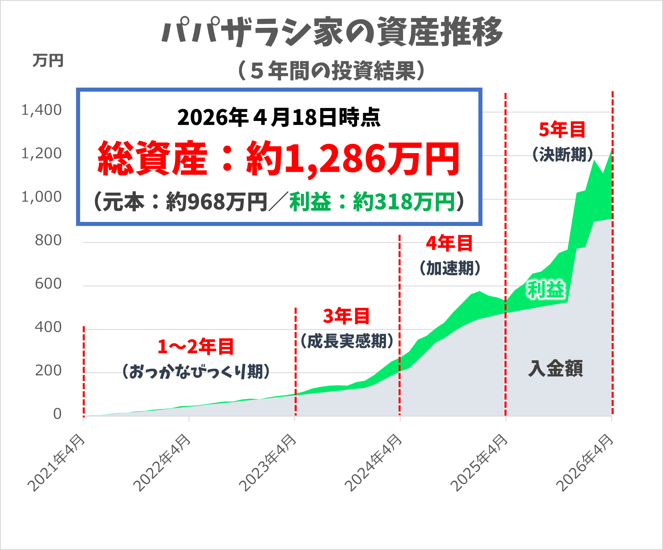 5年間で投資資産は約1,200万円まで増えました。