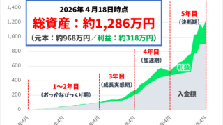 投資 【投資5年の全記録】月1万円→資産1200万円までの推移と3つの転換点 はじめに前回の記事では、我が家の投資状況(資産1,200万円)を公開しました。今回はその続きとして、**「どうやってここまで増えてきたのか」**を時系列でまとめました。この記事の要旨月1万円から資産1200万円に至るまでの具体的なプロセスが... 2026.04.25 投資資産形成
